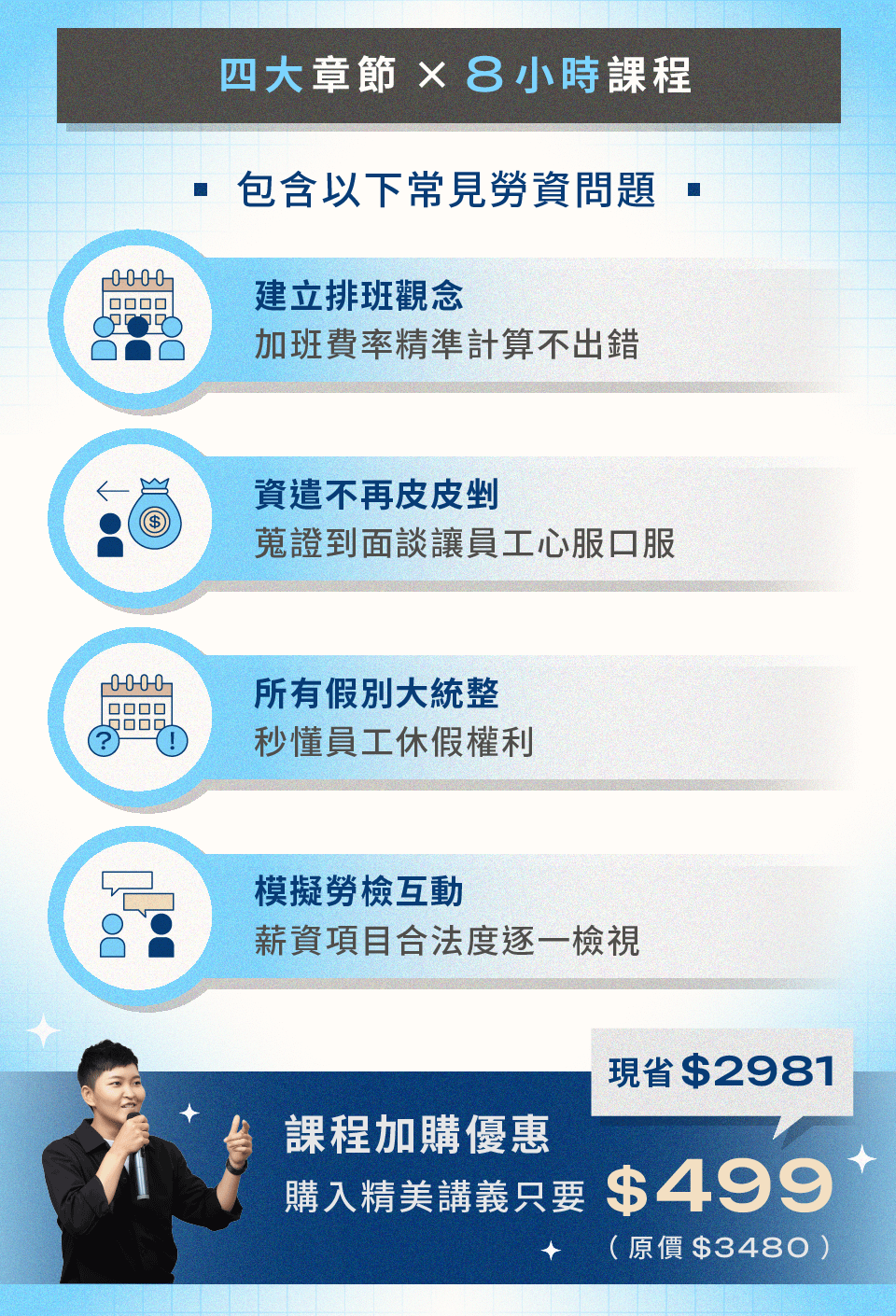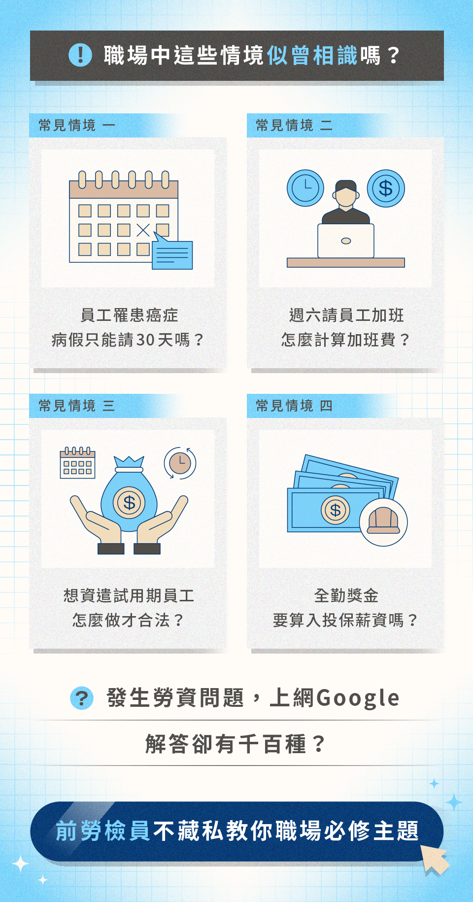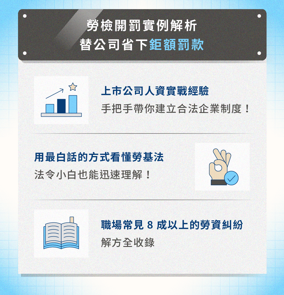 從勞動法研究所畢業後,我白天當勞檢員跟公司吵架開罰,晚上去新北市勞工大學講課,就這樣講了十年。後來當了人資,為公司制定一套符合法令,又不至於讓老闆覺得你不食人間煙火的管理制度。